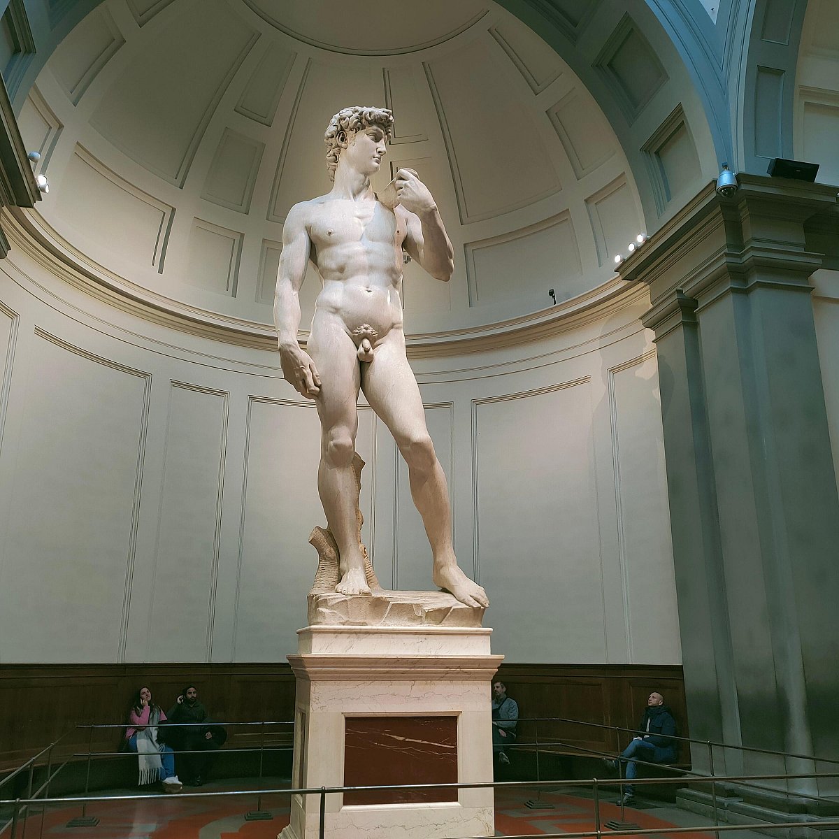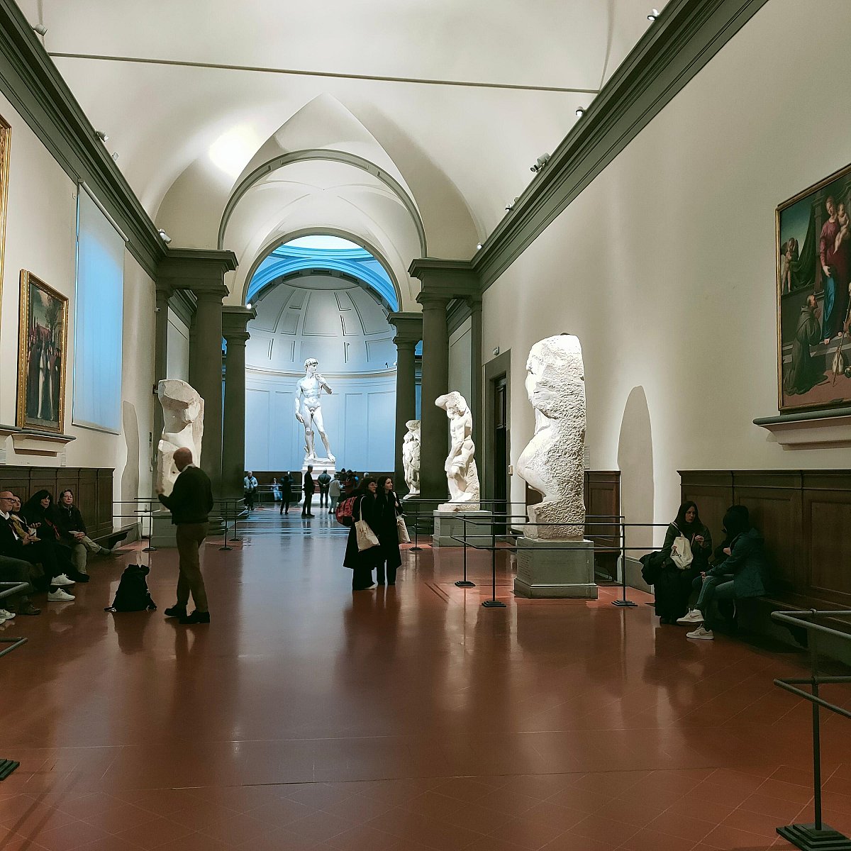 步入这座宏伟大厅,您将看见矗立在基座上的惊世巨作《大卫像》,但在抵达那里之前,我们将驻足欣赏米开朗基罗为教皇朱利奥二世创作的著名雕塑群《囚徒》。